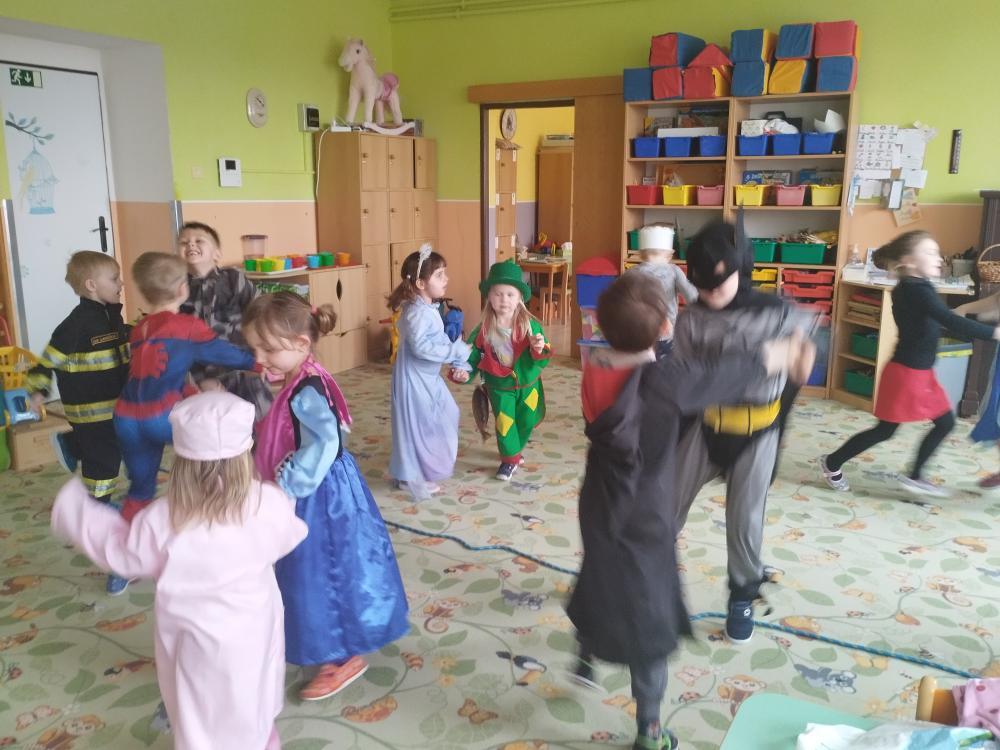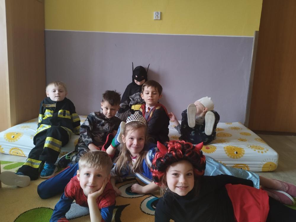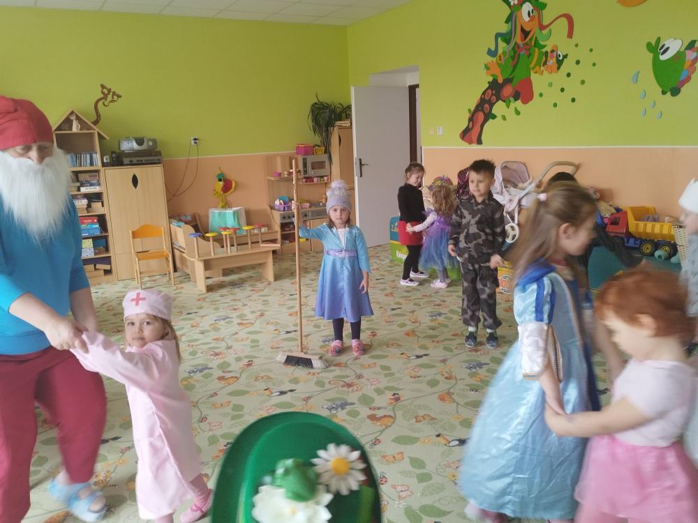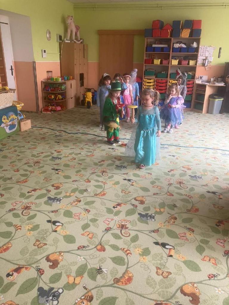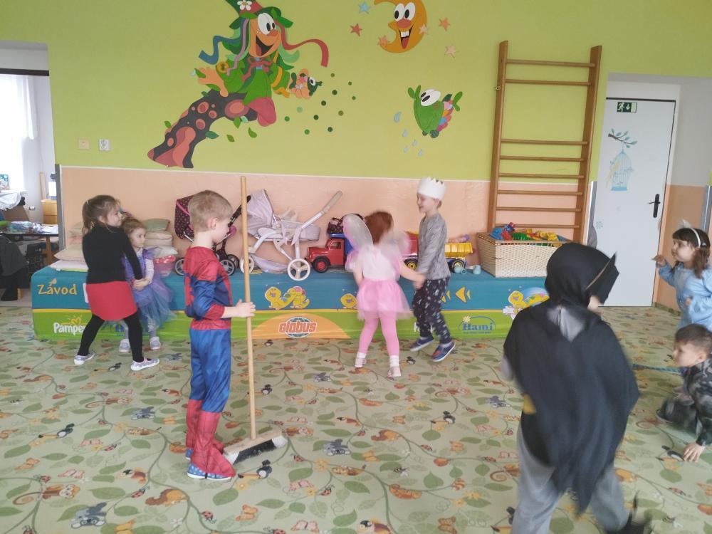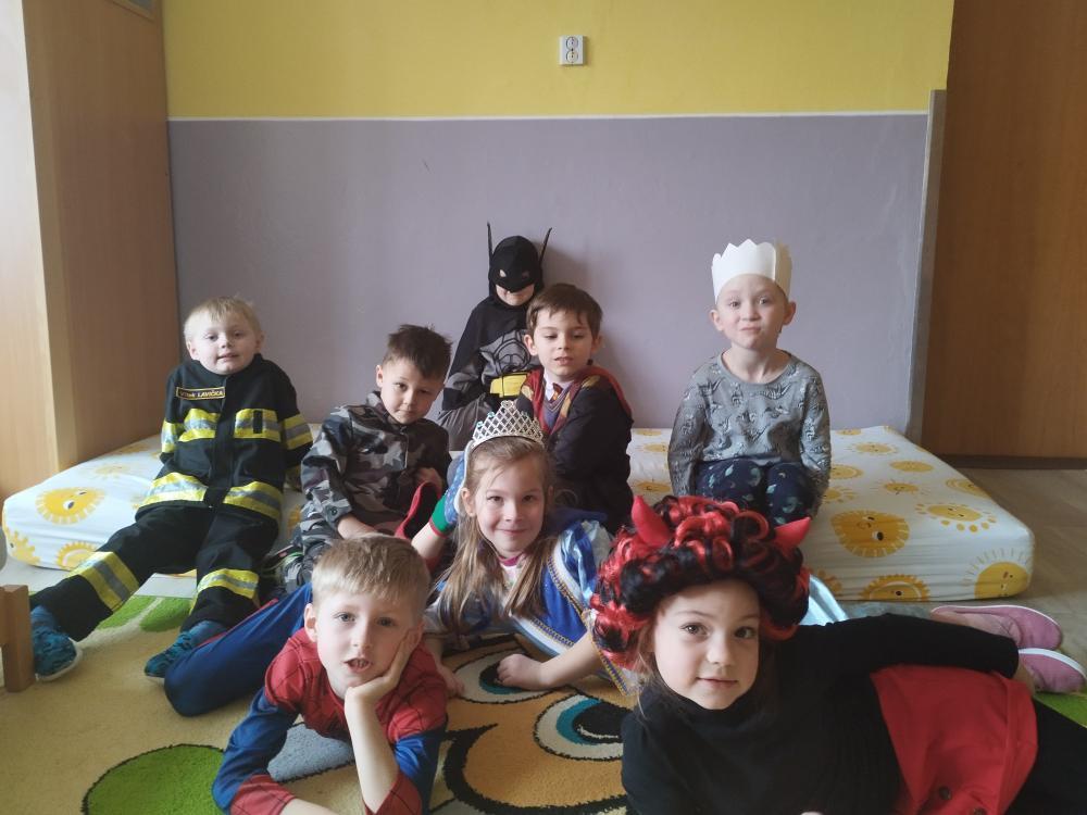 Ve středu 25.2. 2026 se děti vyřádily v rozmanitých karnevalových maskách (Elsa a Anna, princezna, víla, lékařka, čertice, vlk, voják, vodník, hasič, Spiderman, Batman, Harry Potter). Paní učitelky se tentokrát proměnily za hodného taťku Šmoulu a zlého Gargamela :)