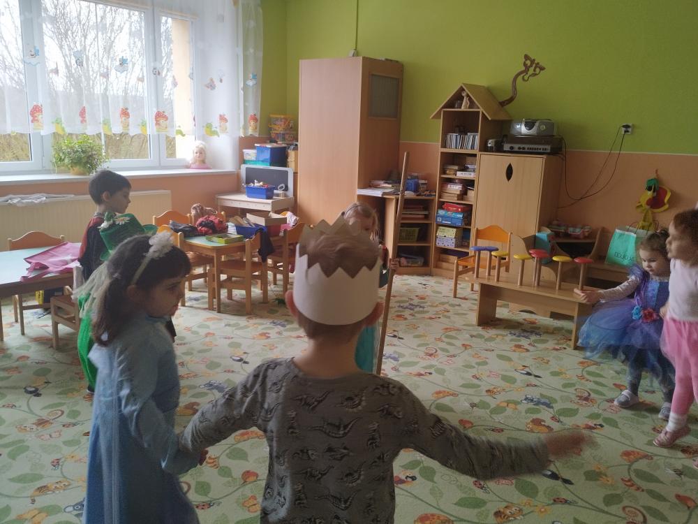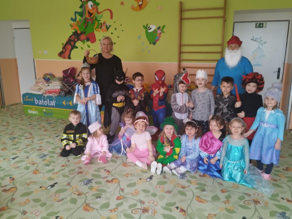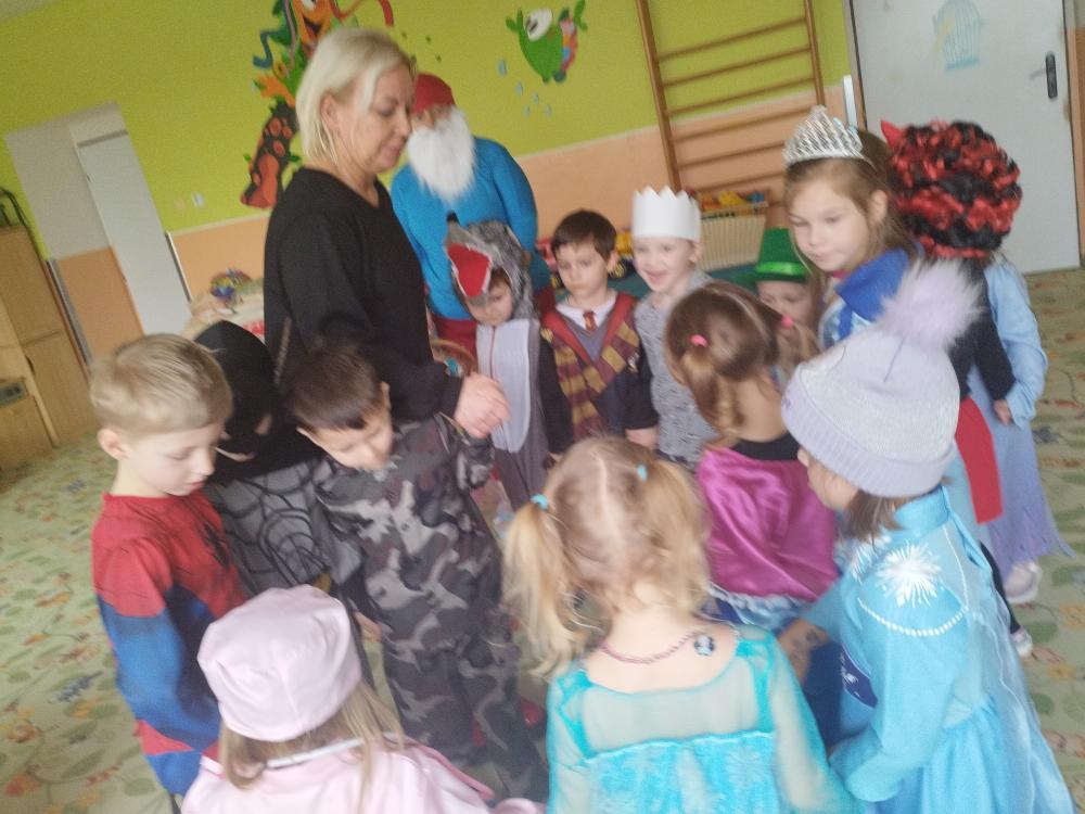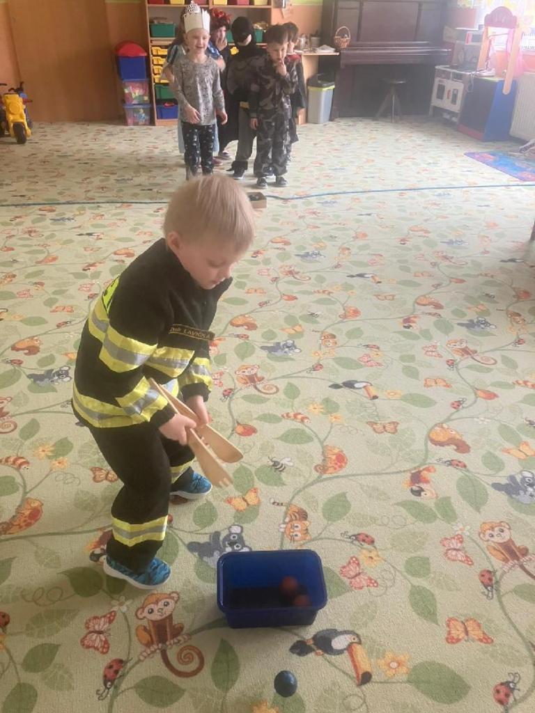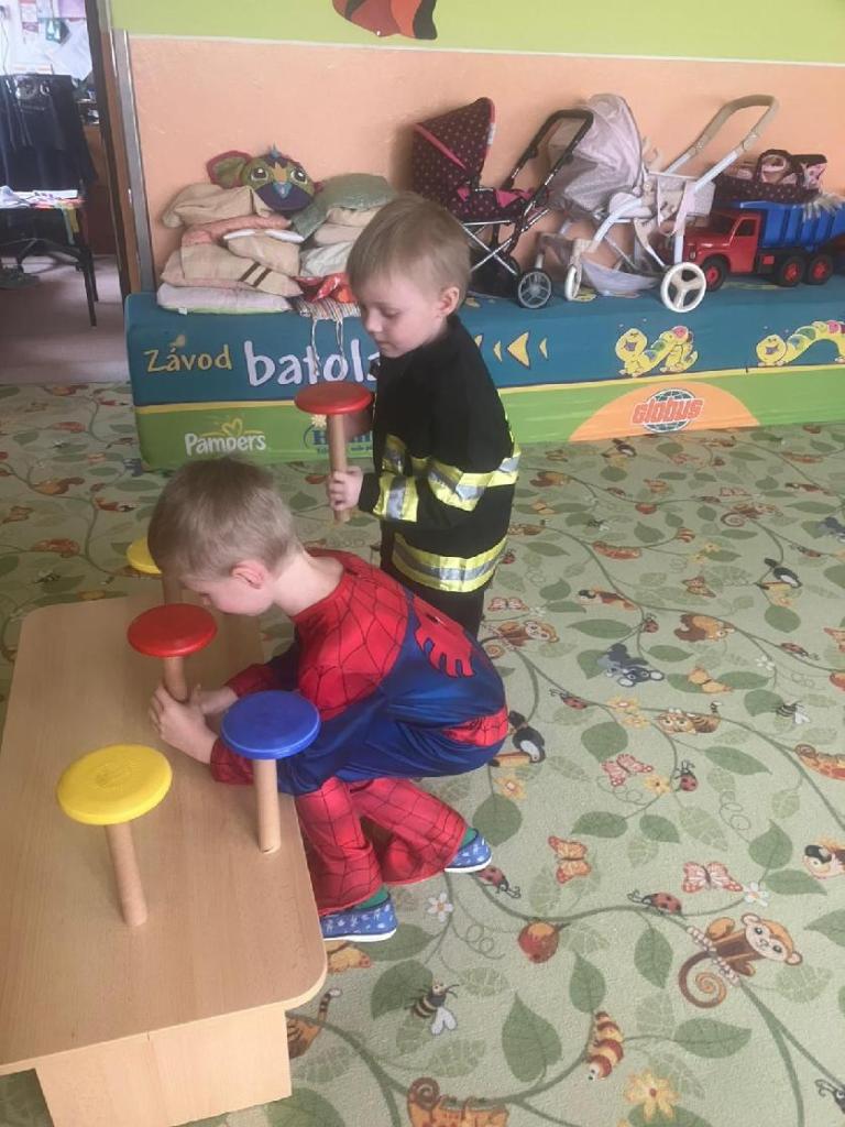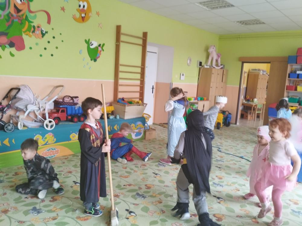 Ve středu 25.2. 2026 se děti vyřádily v rozmanitých karnevalových maskách (Elsa a Anna, princezna, víla, lékařka, čertice, vlk, voják, vodník, hasič, Spiderman, Batman, Harry Potter). Paní učitelky se tentokrát proměnily za hodného taťku Šmoulu a zlého Gargamela :)
